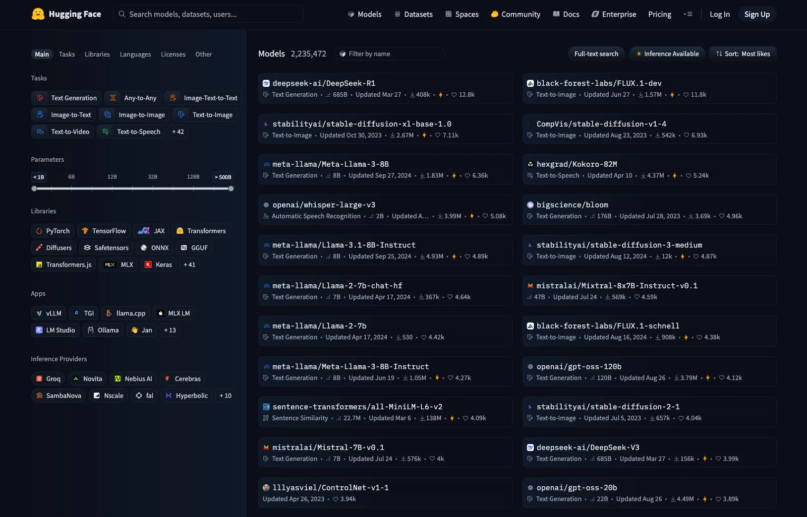 Veldig mange modeller til forskjellig behov som kan lastes ned og kjøres lokalt fra Huggingface.